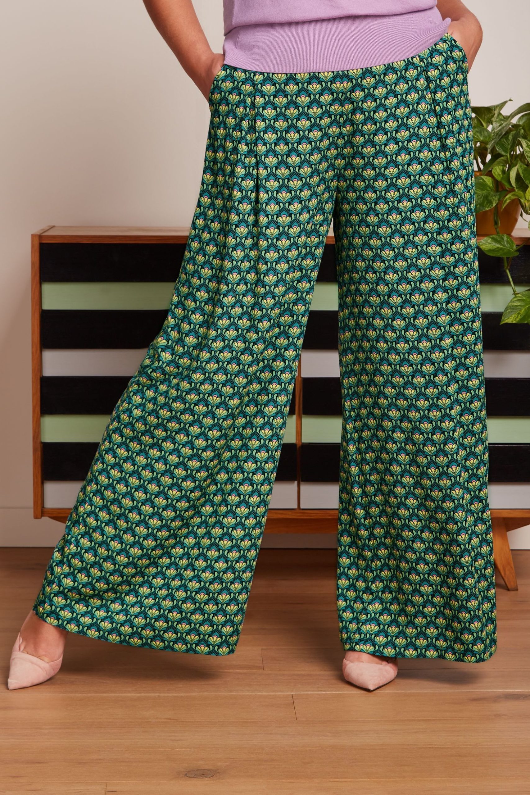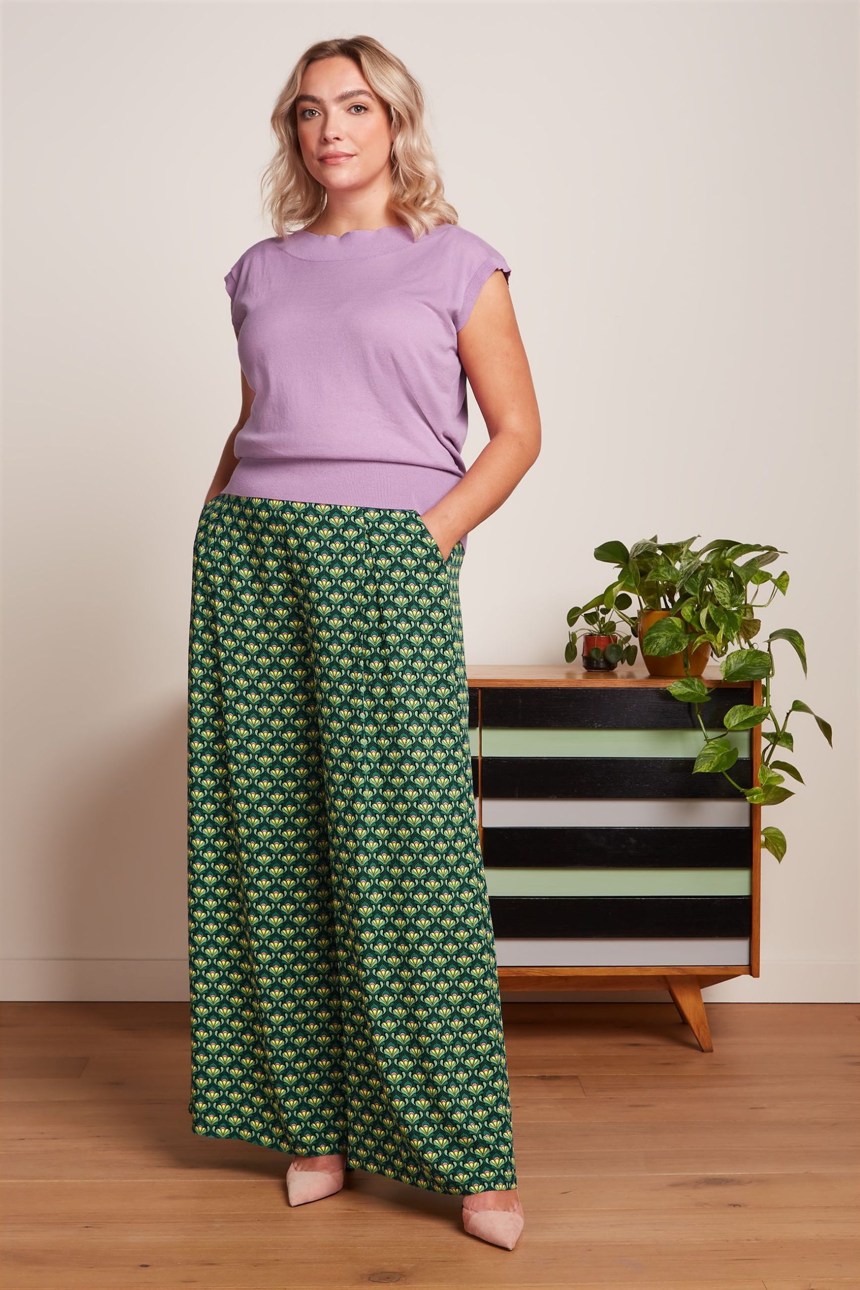 Stylish wide leg pants with flattering front pleats and practical side pockets.