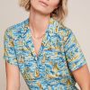 This blouse features a stretchy viscose jersey fabric with a graphic print, long sleeves finished with cuffs, a classic collar, and a button-down front for easy wear.
