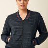 This blouse features a stretchy viscose jersey fabric with a graphic print, long sleeves finished with cuffs, a classic collar, and a button-down front for easy wear.