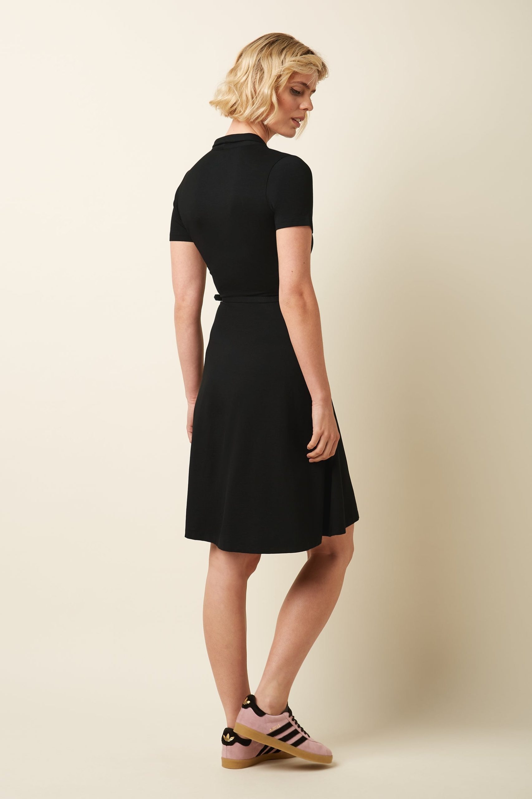 Elevate your wardrobe with the Emmy Dress Viscose Classic. Its elegant shawl collar and short sleeves create a timeless look, while the stretch viscose fabric ensures all-day comfort. The knee-length, flared silhouette, enhanced by a tie belt and button closure, flatters every figure. Perfect for making a confident statement at any event, this dress combines style and ease effortlessly.