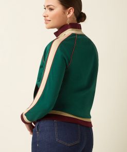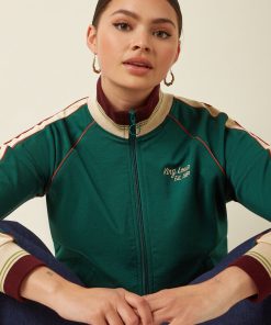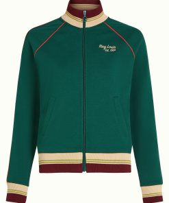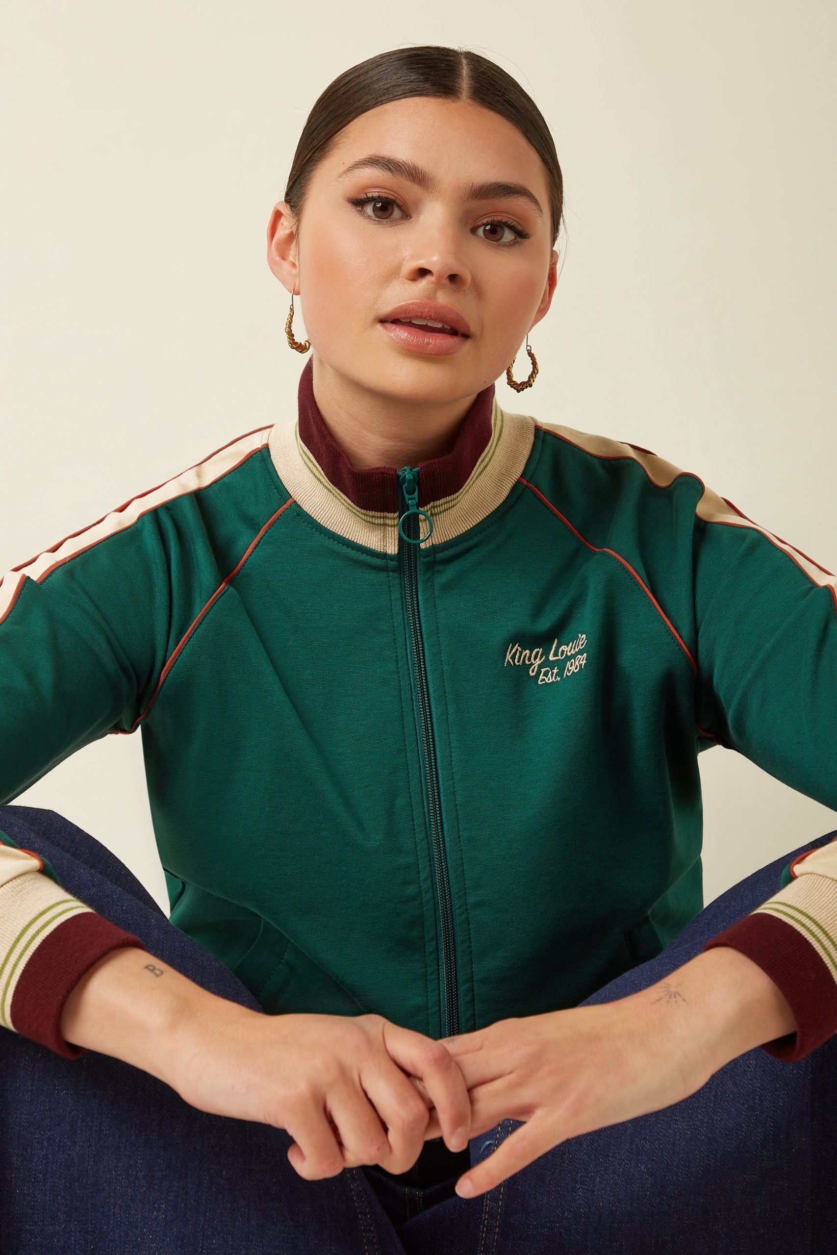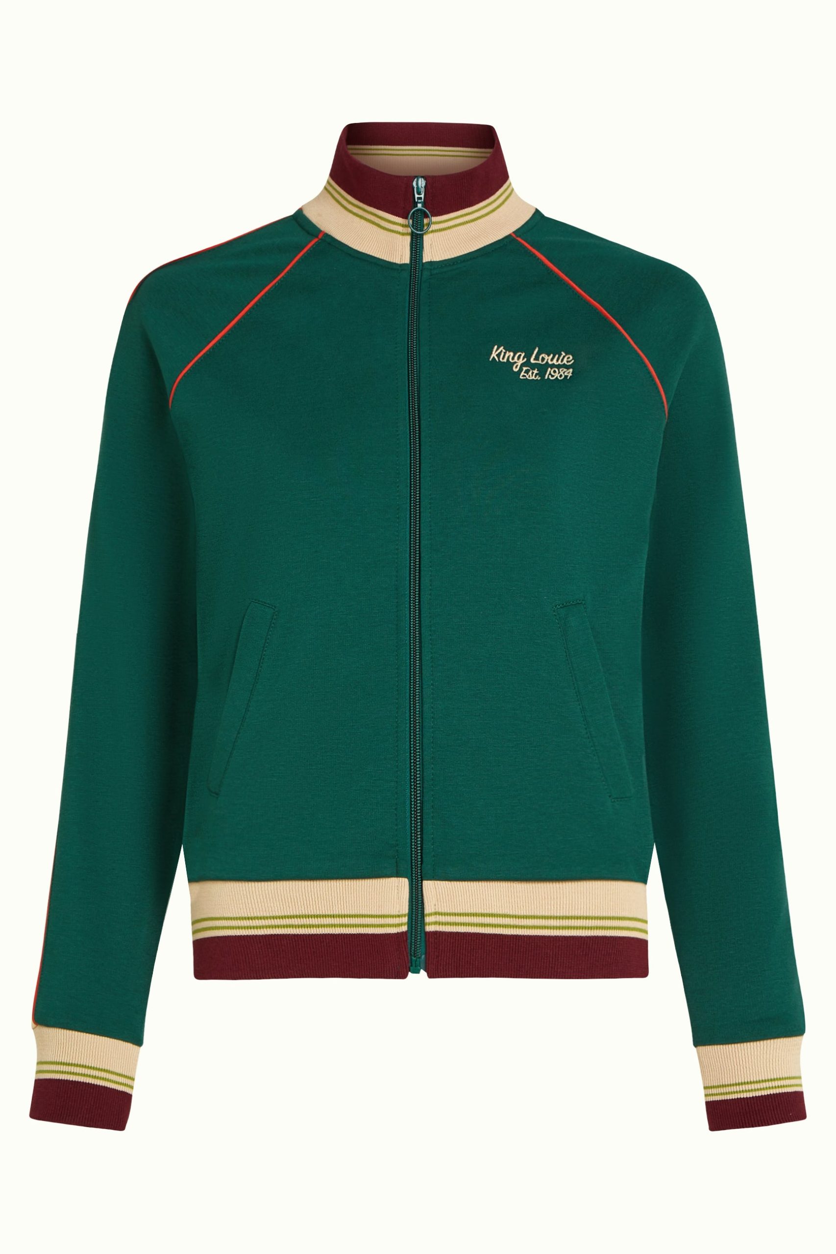 This Lila Coljack Daytona Sweat features King Louie embroidery with contrasting collar, cuffs, and waistband for a stylish look. Made from stretchy cotton interlock, it offers comfort and flexibility. The long sleeves end in snug cuffs, complemented by a knitted collar and a convenient zipper closure.