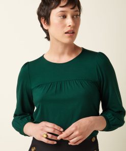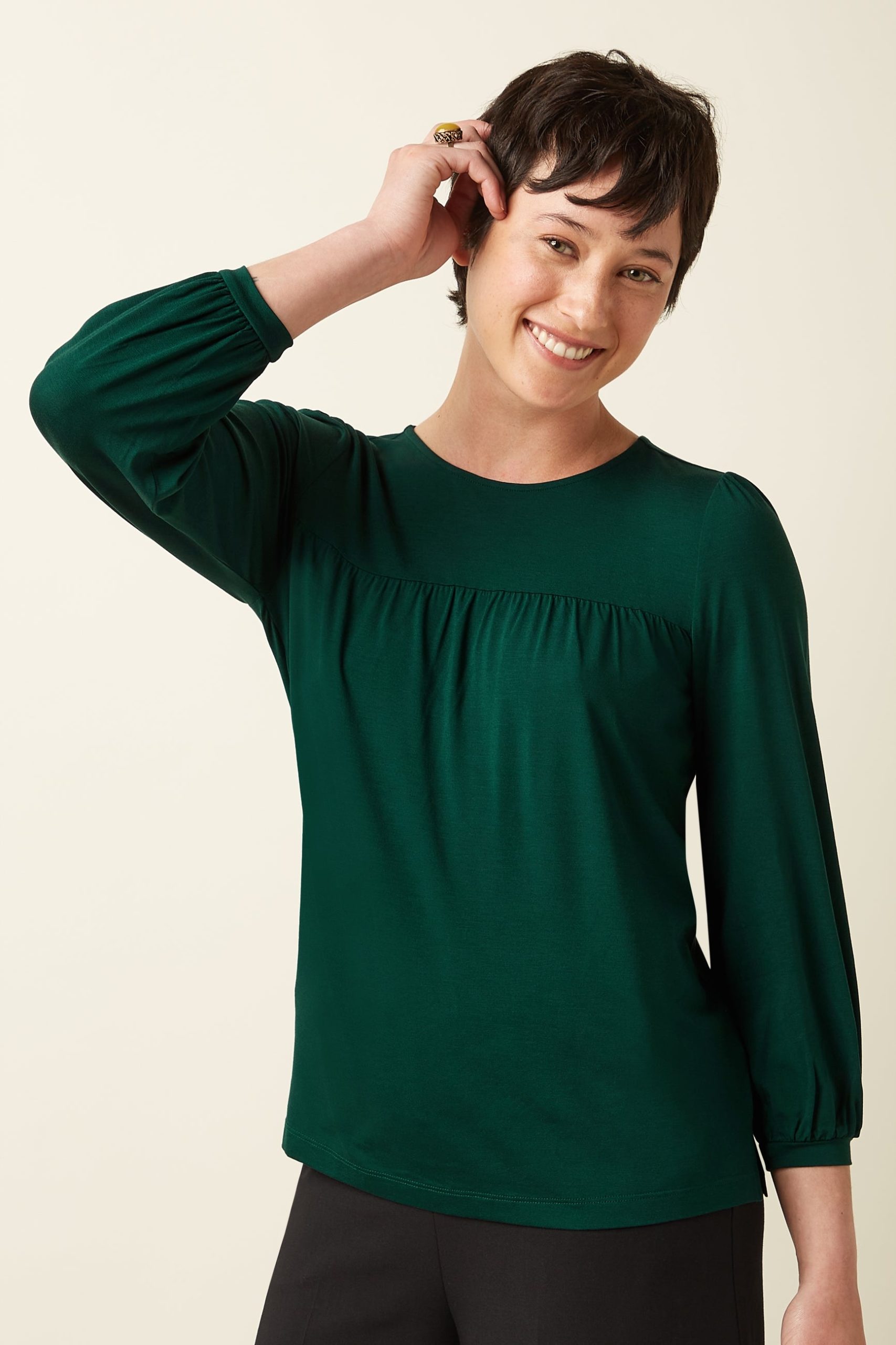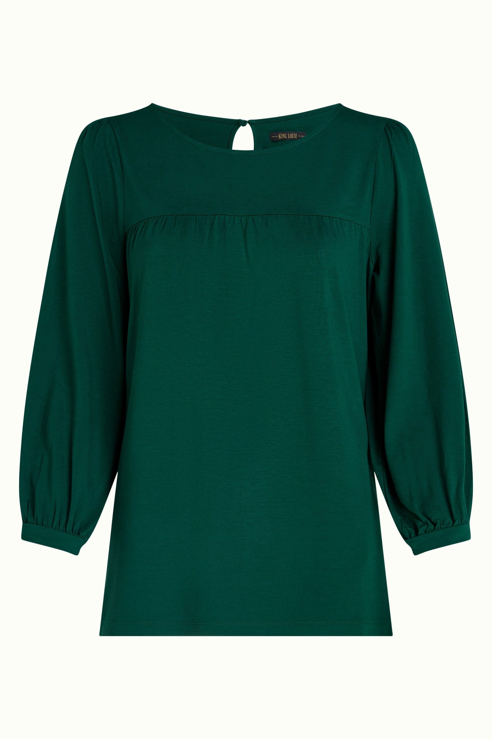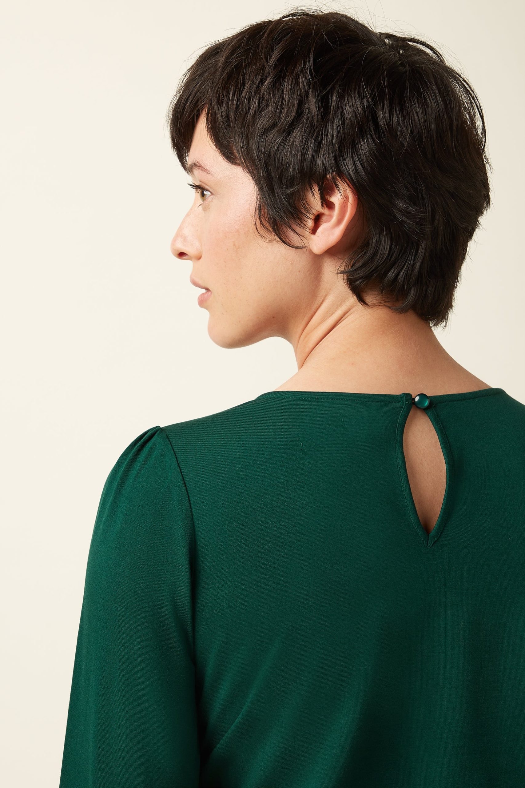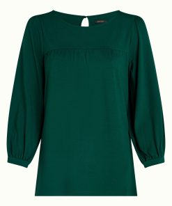 The Luella Top Viscose Light offers delicate yoke pleats, 3/4 cuffed sleeves, and a round neckline with keyhole button, crafted from stretchy viscose jersey for comfort and style.