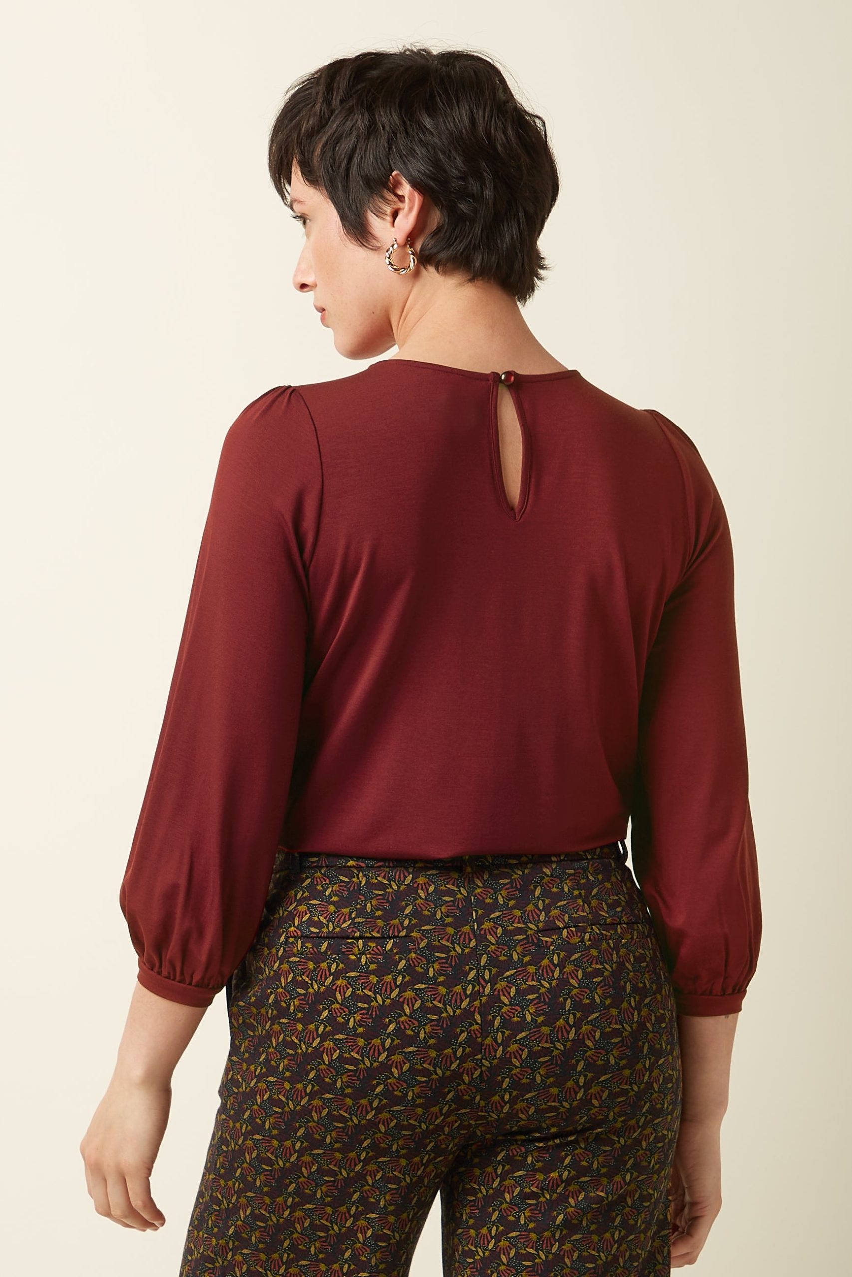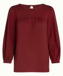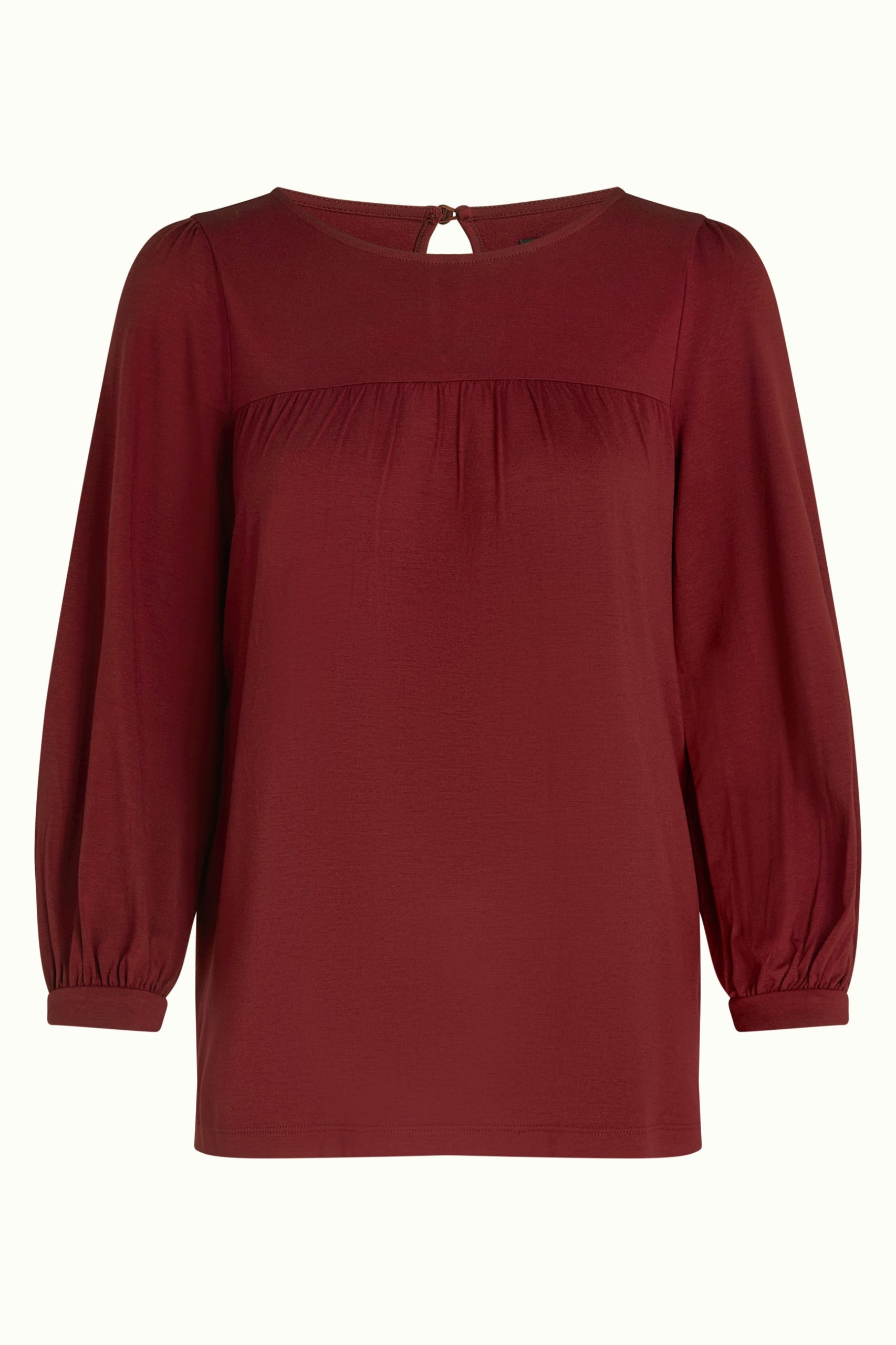 The Luella Top Viscose Light offers delicate yoke pleats, 3/4 cuffed sleeves, and a round neckline with keyhole button, crafted from stretchy viscose jersey for comfort and style.