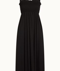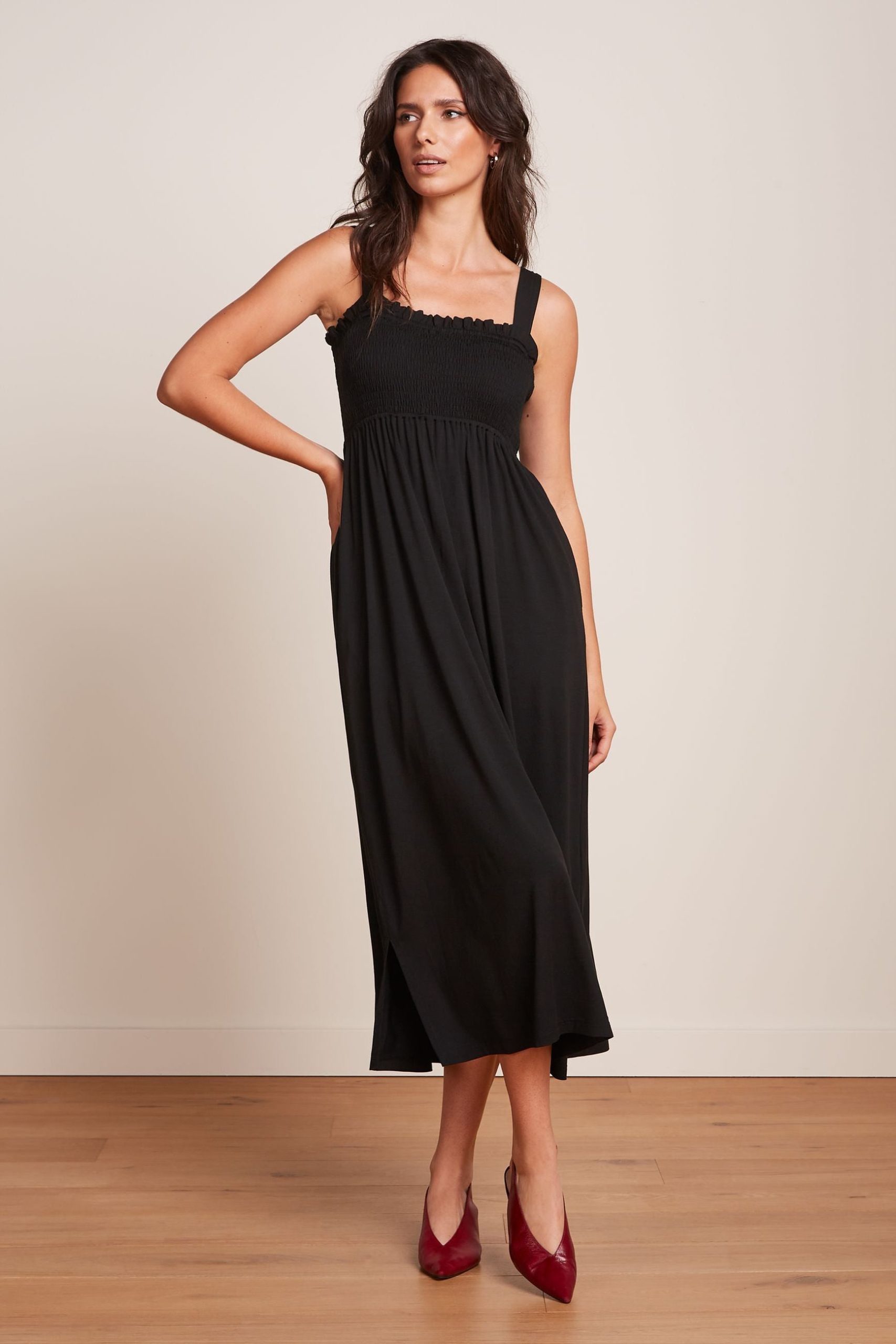 Long jersey dress with a unique smock-elastic top that adds a touch of flirty and femininity. The straight line silhouette creates a modern look, perfect for different occasions.