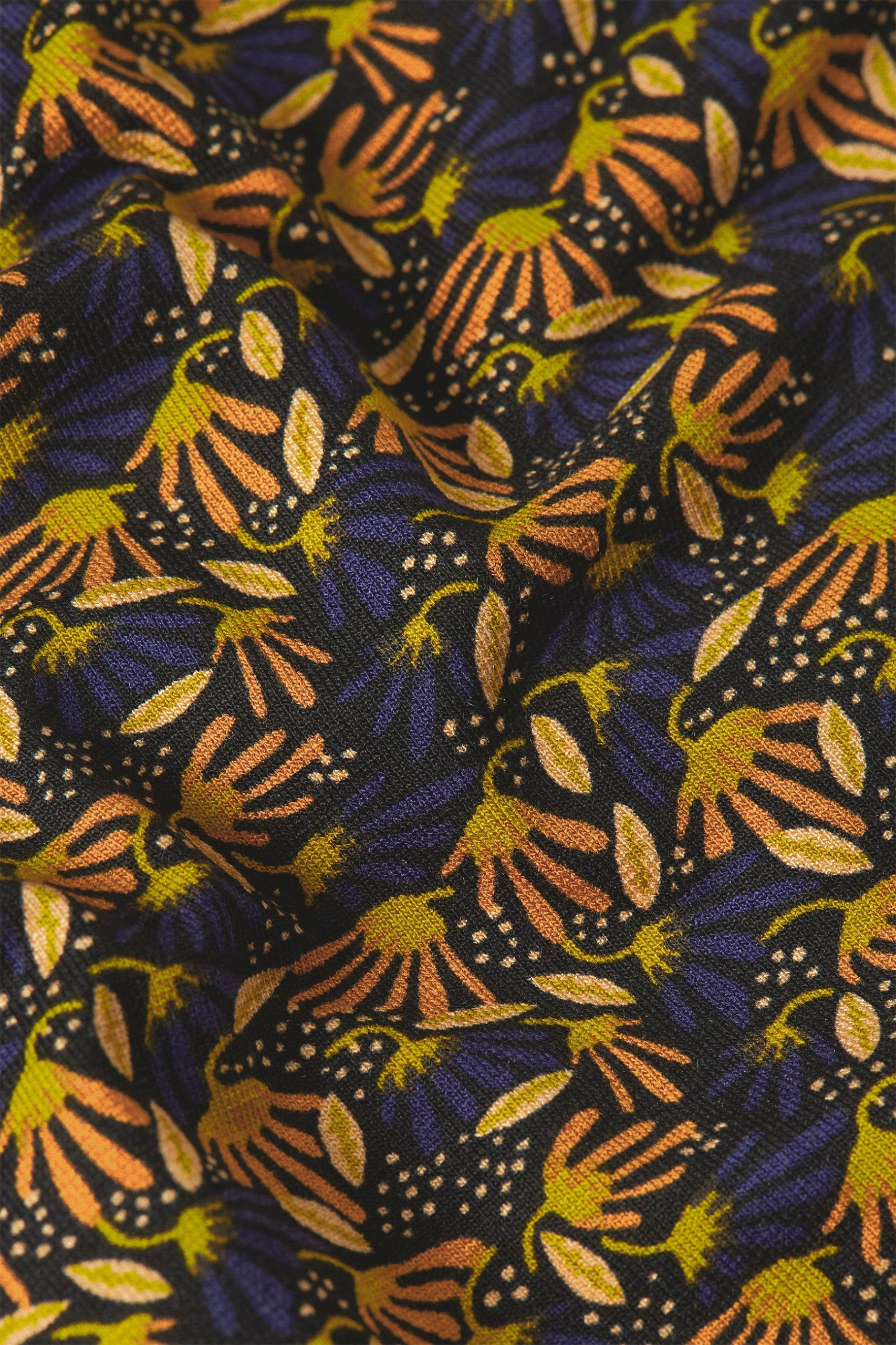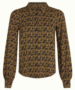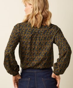 The Maisie Blouse in Mirth Jersey offers a comfortable stretch viscose fabric with a lovely floral design. It features long sleeves, a classic collar, and a button closure, making it a reliable and stylish choice.