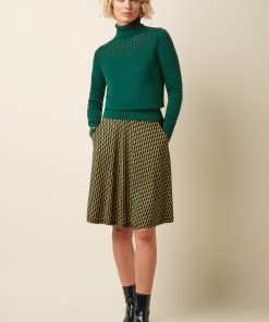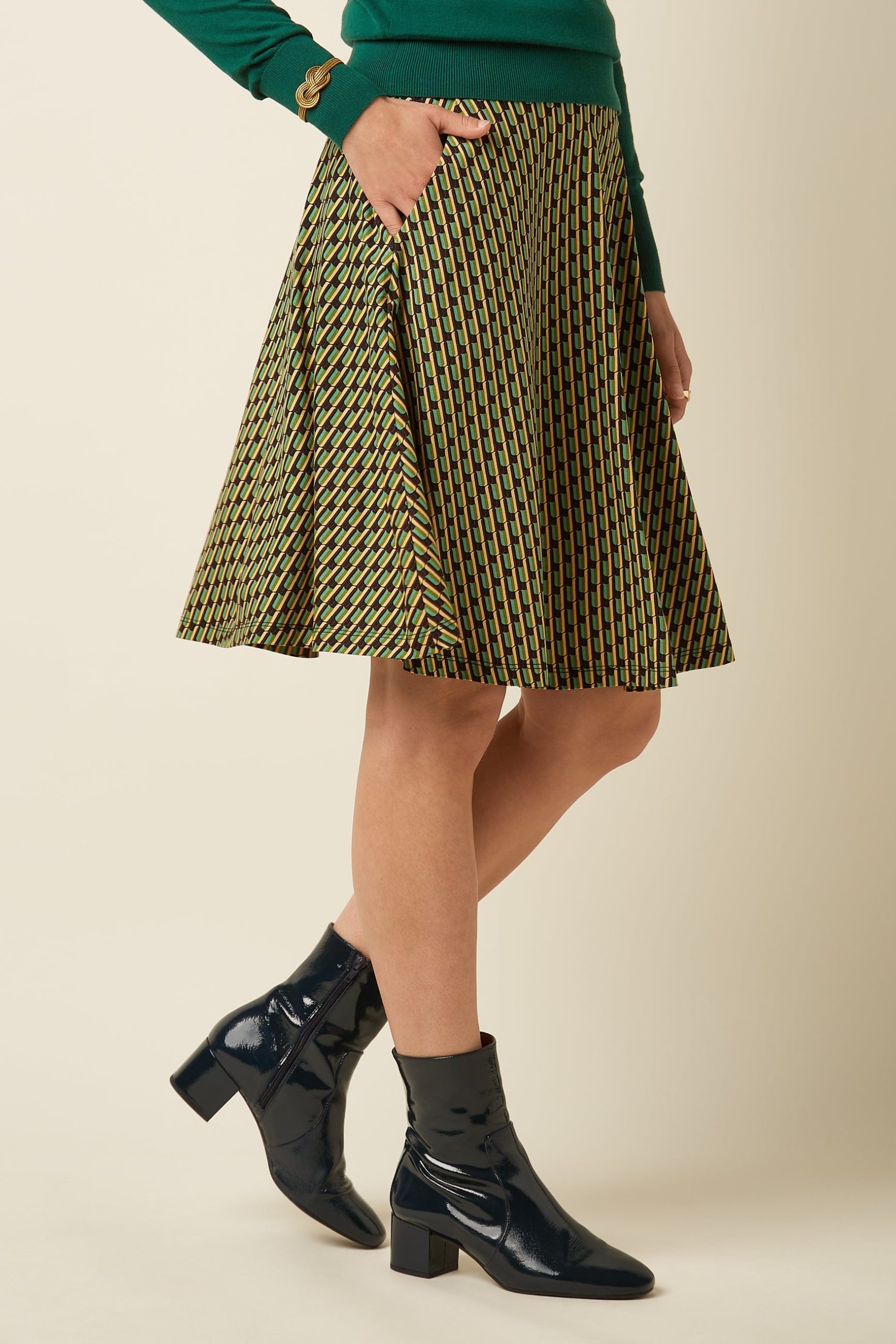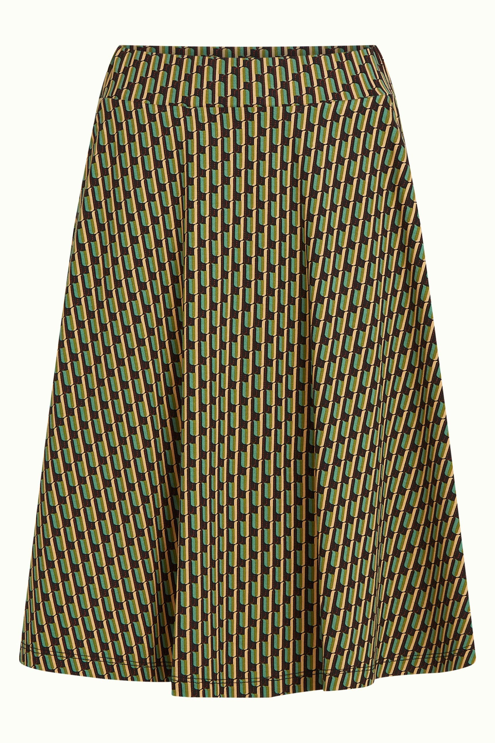 This midi skirt features a comfortable elastic waistband, side pockets, and a flattering flared shape. Made from stretchy viscose jersey with a stylish graphic print, it offers both comfort and flair for everyday wear.